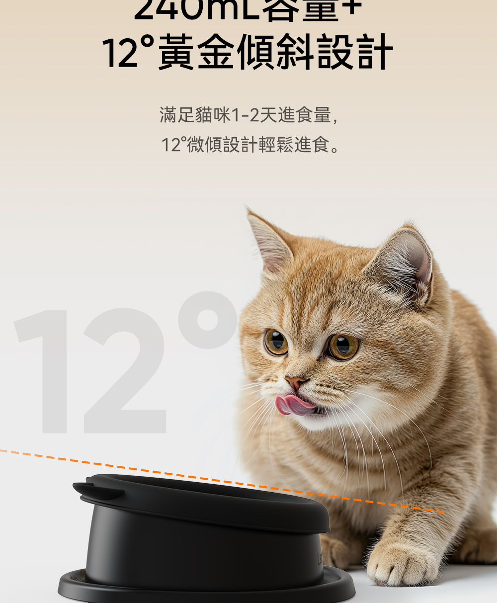 12°黃金傾斜設計:符合貓咪進食習慣,減少頸椎壓力,提升舒適度。