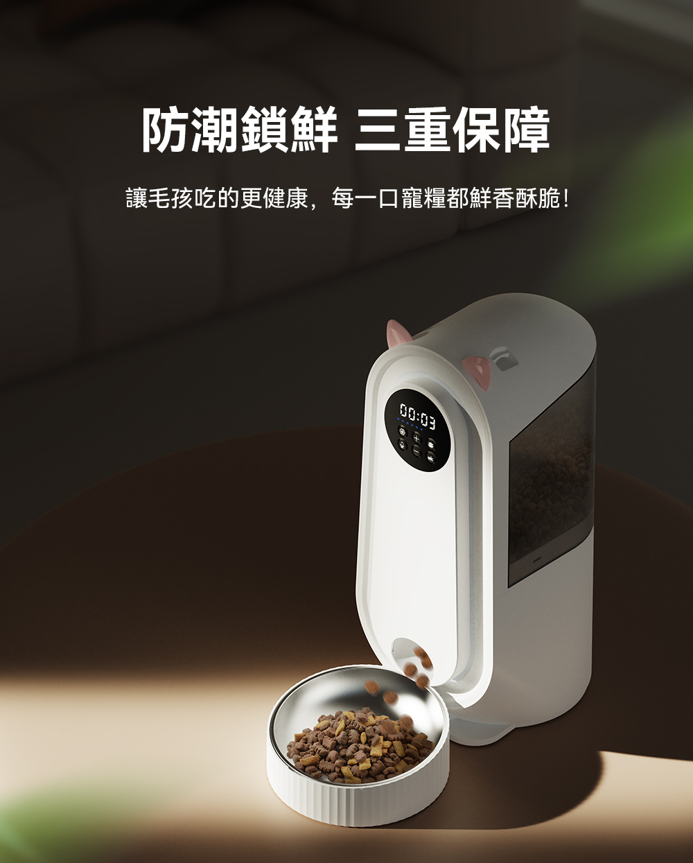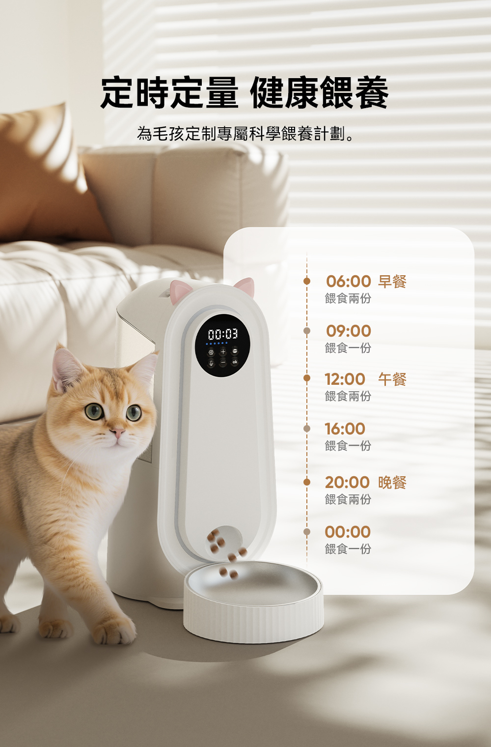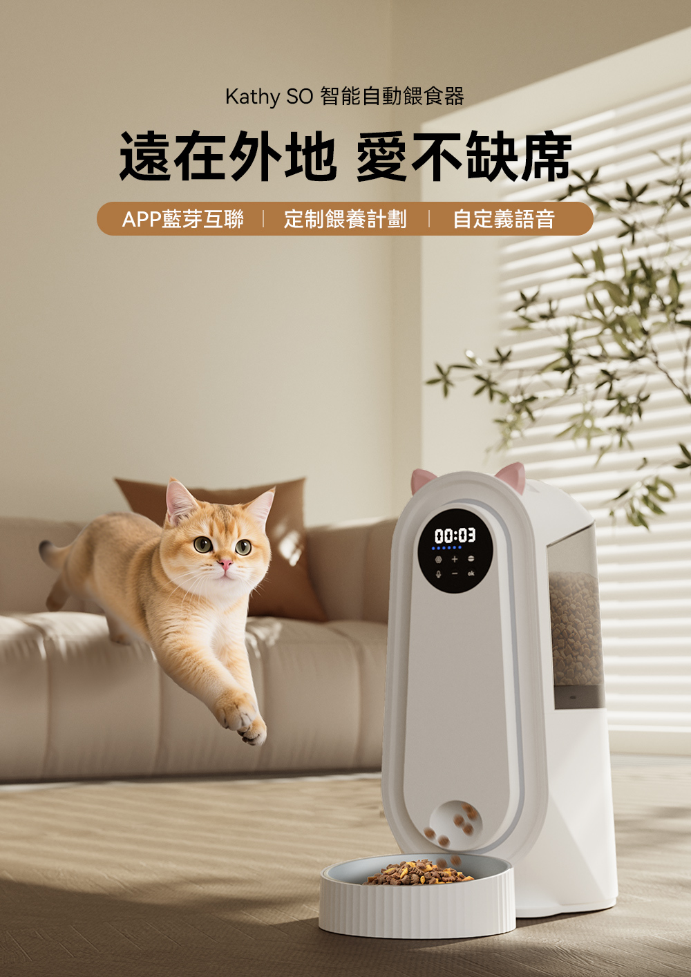 Kathy SO 智能自動餵食器,在外地也能隨時掌握毛孩的狀況,給予貼心陪伴。讓每一餐都準時精準,守護毛孩的健康不間斷。無論大顆乾糧還是凍乾食品,都能順暢投餵不卡糧,是現代飼主的智慧育寵好幫手!