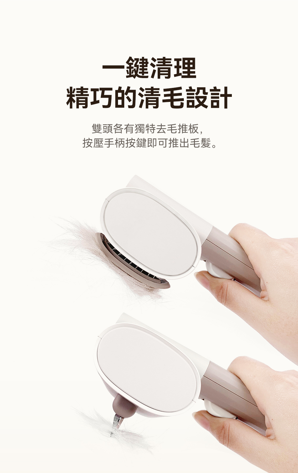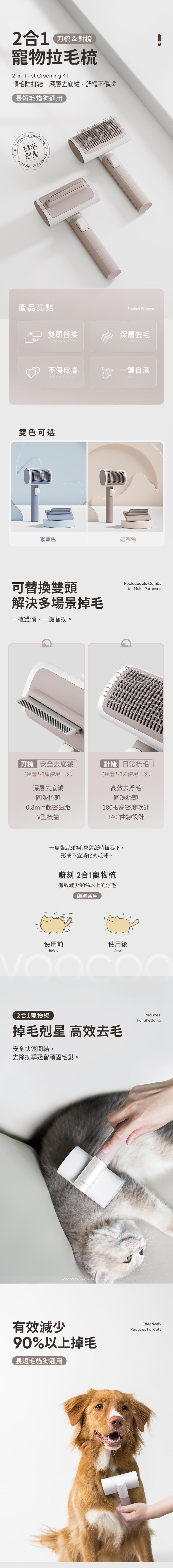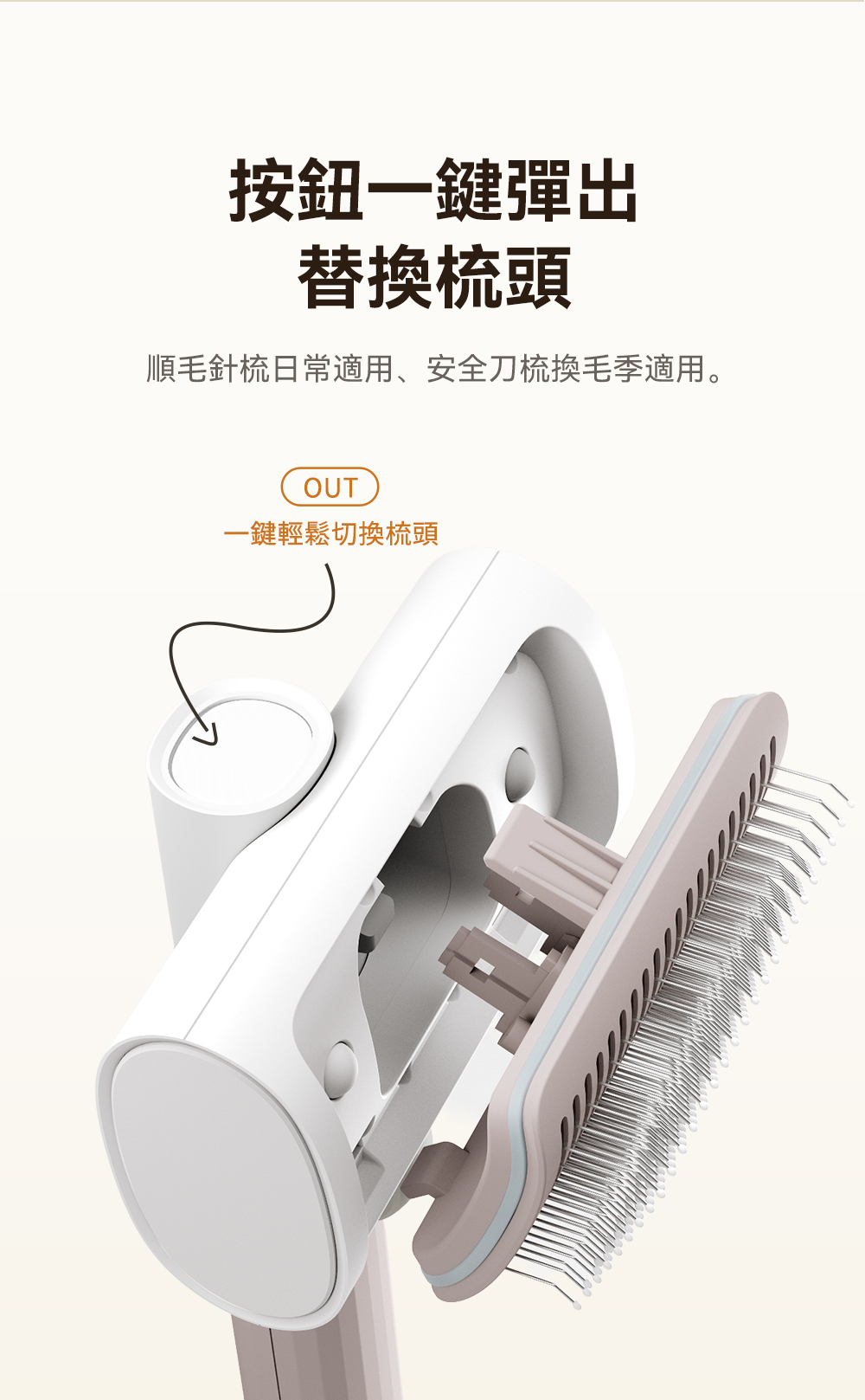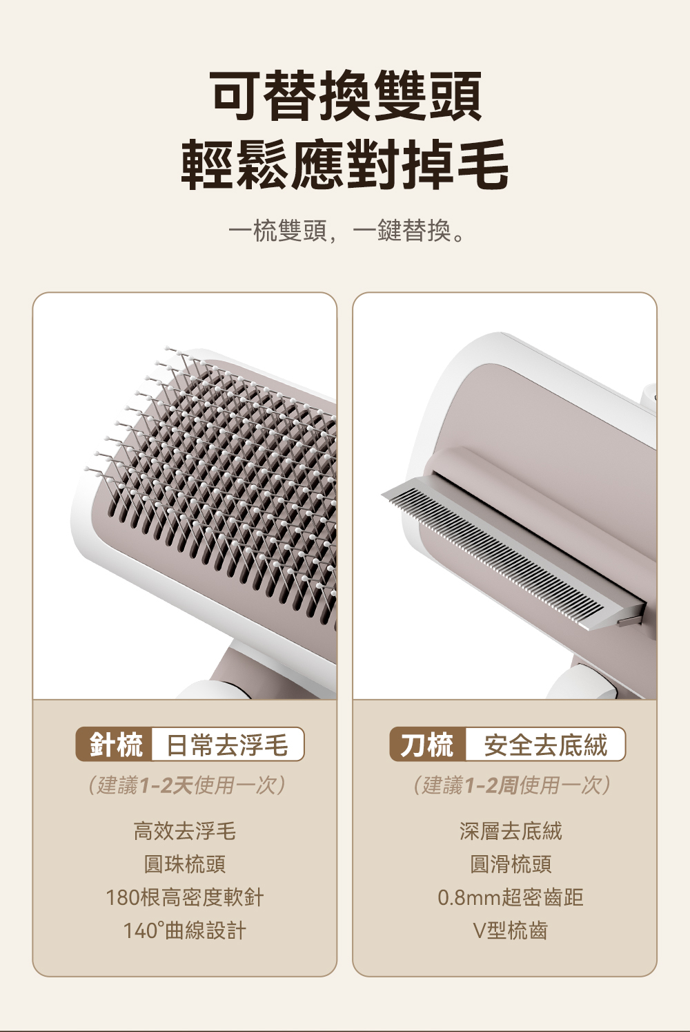 ・可替換雙梳齒設計,讓您輕鬆應對不同的寵物毛髮需求,而且買一年握柄保固。
