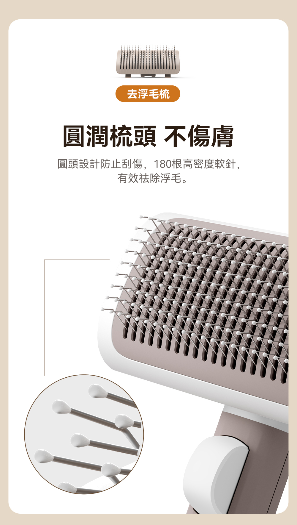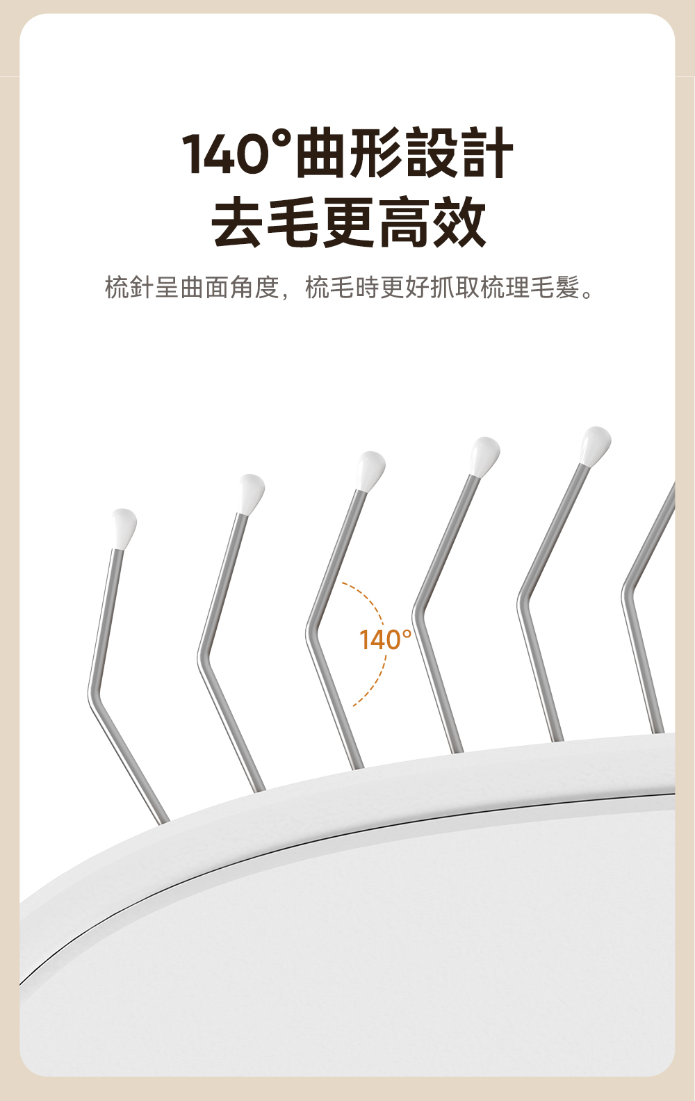 ・刷頭採用電鍍304不銹鋼圓滑梳齒,溫和且不傷害寵物皮膚。