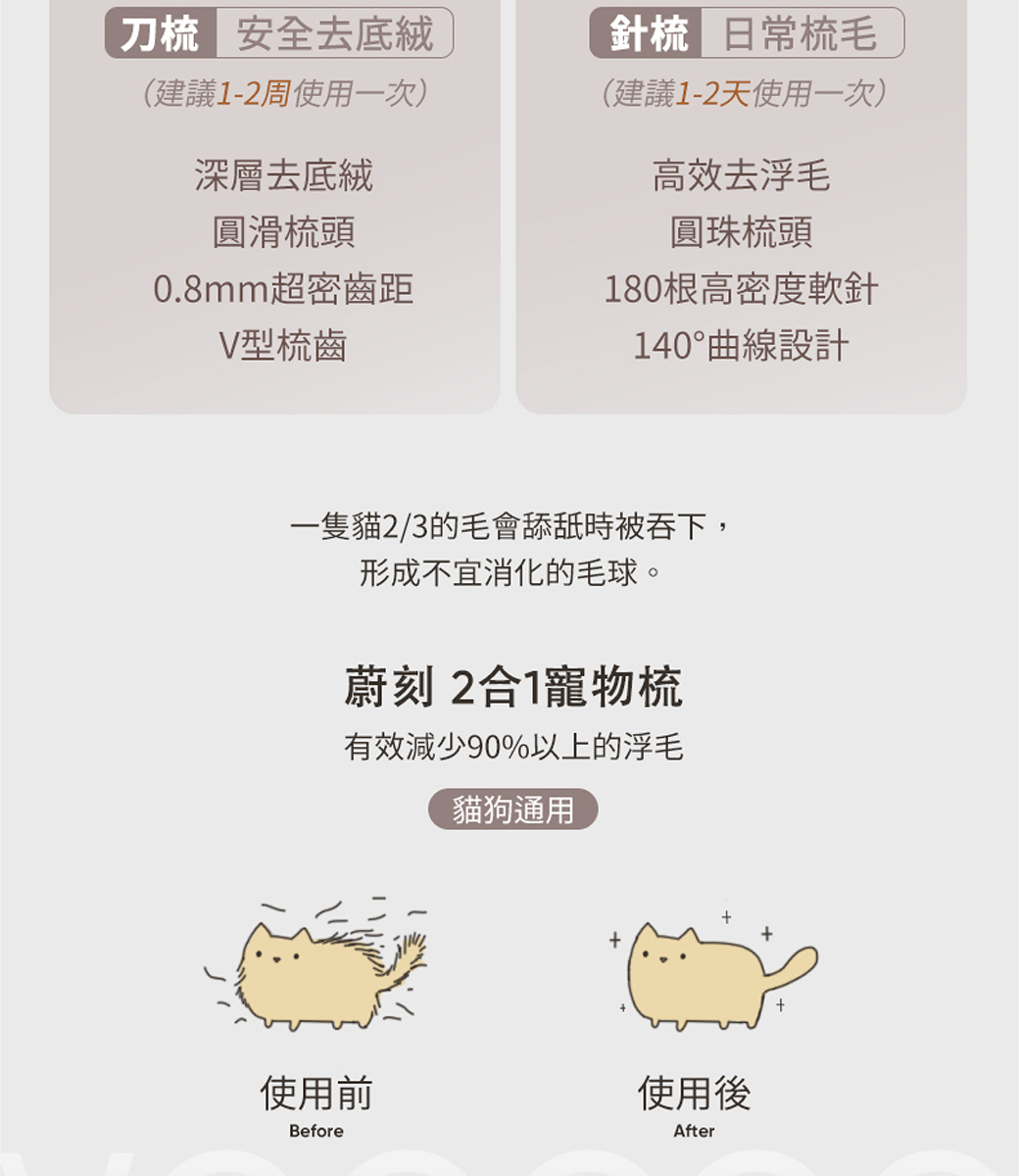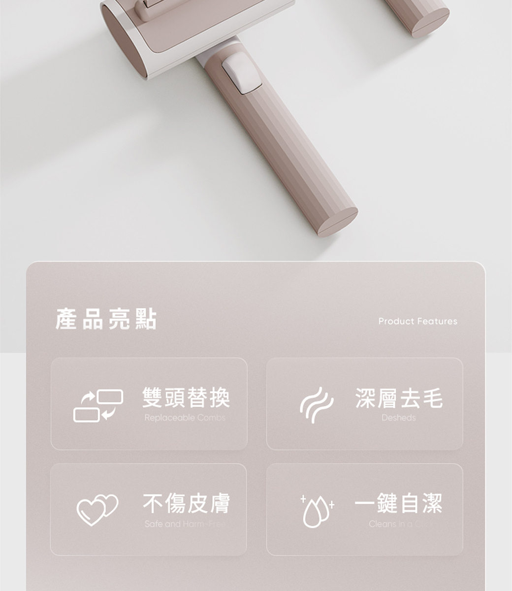・可替換雙梳齒設計,讓您輕鬆應對不同的寵物毛髮需求,而且買一年握柄保固。