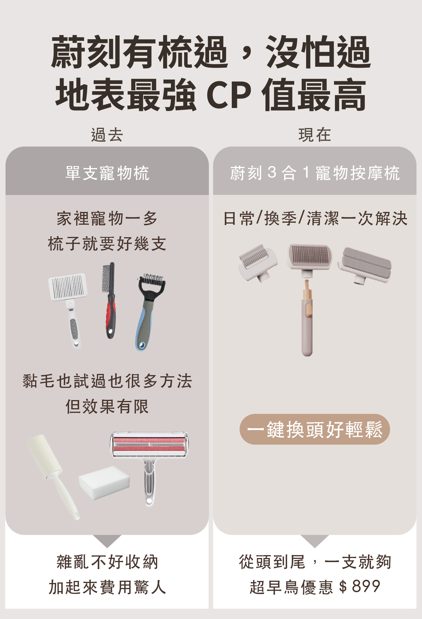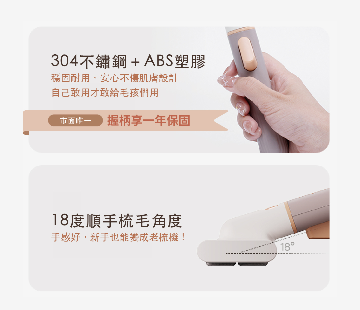 ・可替換雙梳齒設計,讓您輕鬆應對不同的寵物毛髮需求,而且享有一年握柄保固。