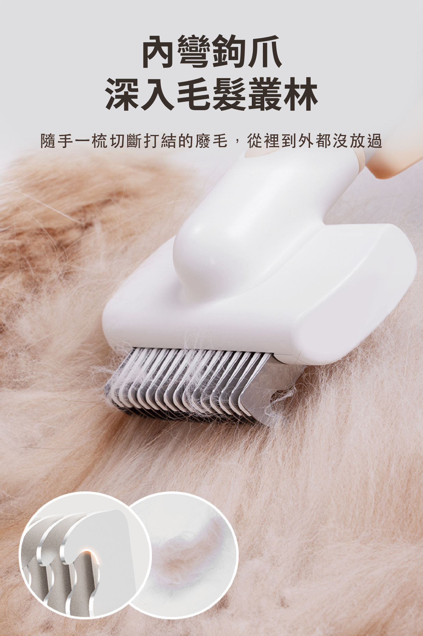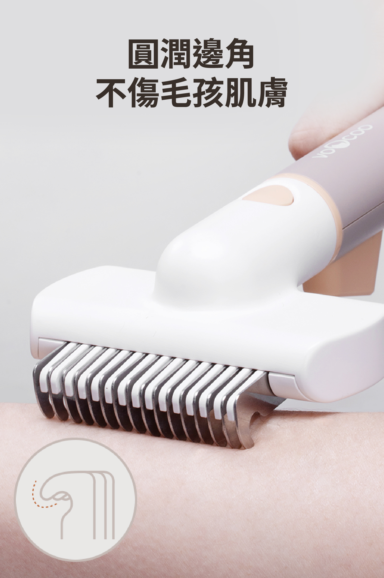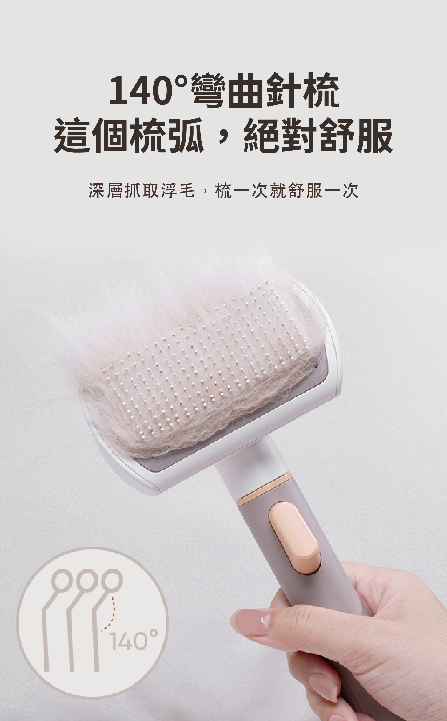 ・刷頭採用電鍍304不銹鋼圓滑梳齒,溫和且不傷害寵物皮膚。