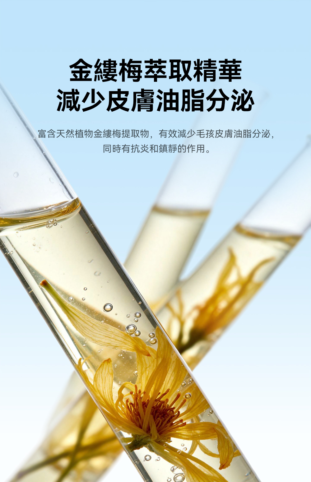 ・金縷梅萃取物溫和洗淨及修復寵物毛髮,讓毛髮保持亮麗柔滑。