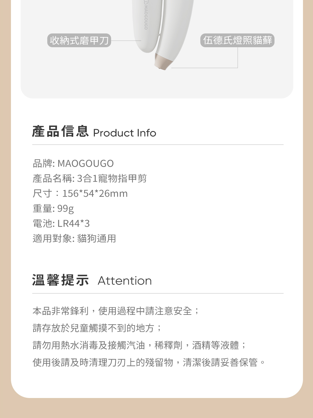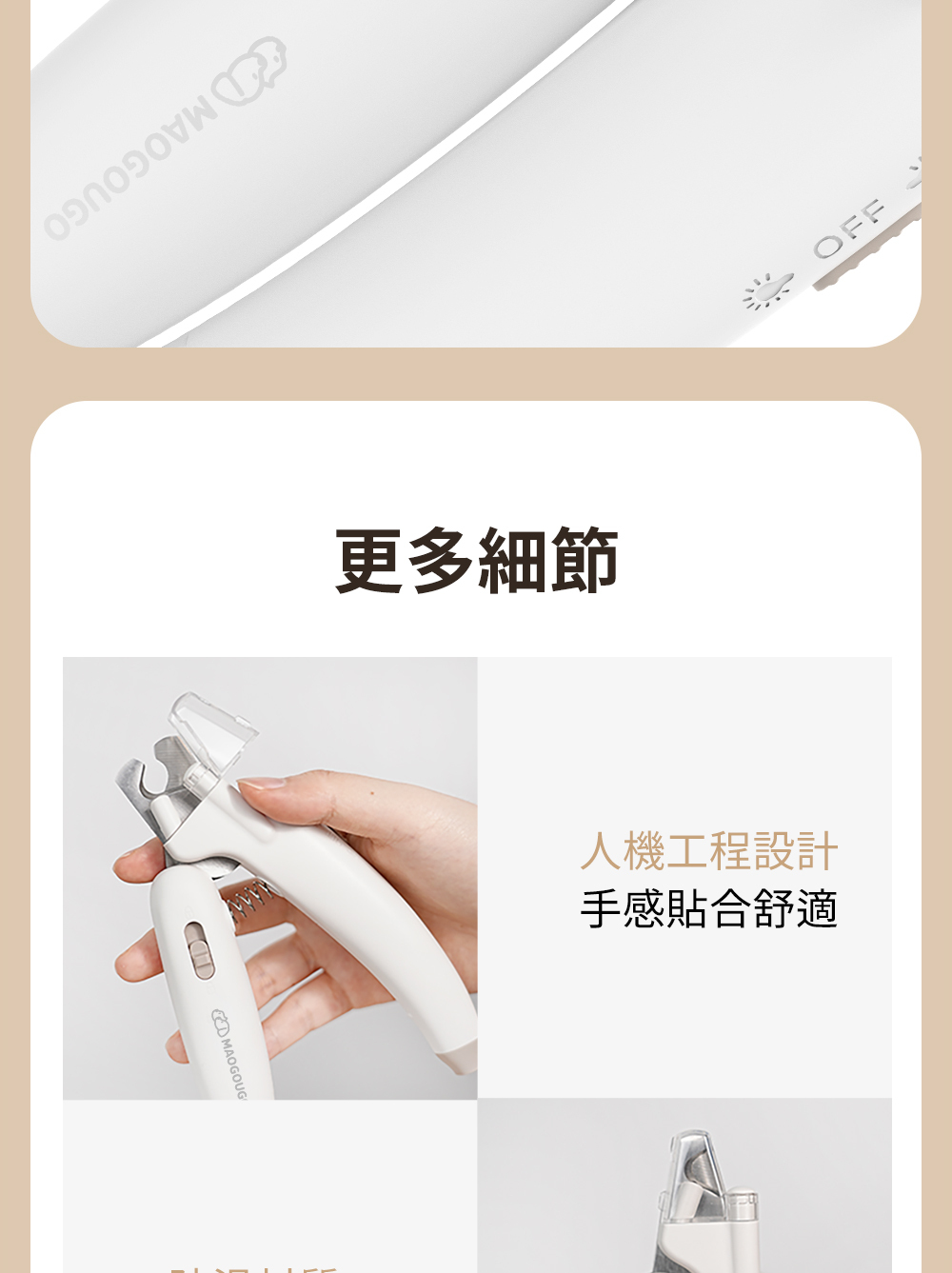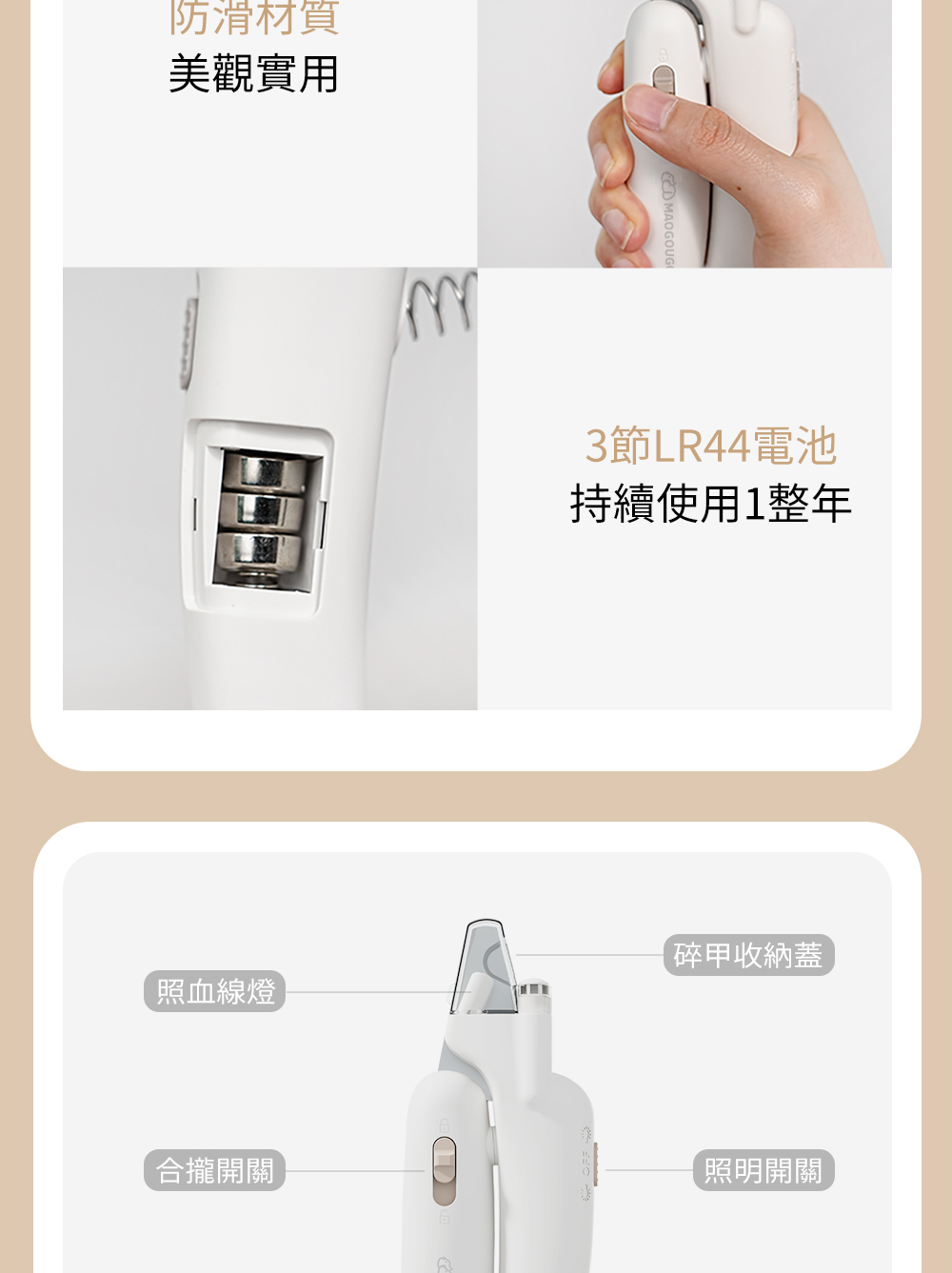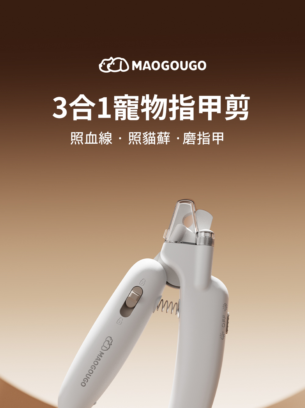 貓狗購 3 合 1 寵物指甲刀:一款結合多功能的寵物修甲工具,方便寵物及主人進行指甲修剪,擁有隱藏式指甲銼隔間和照明系統。