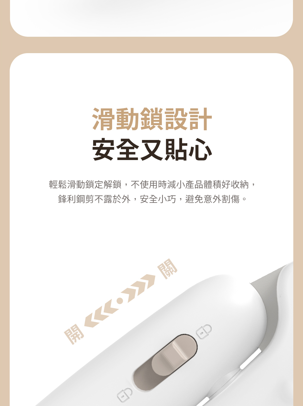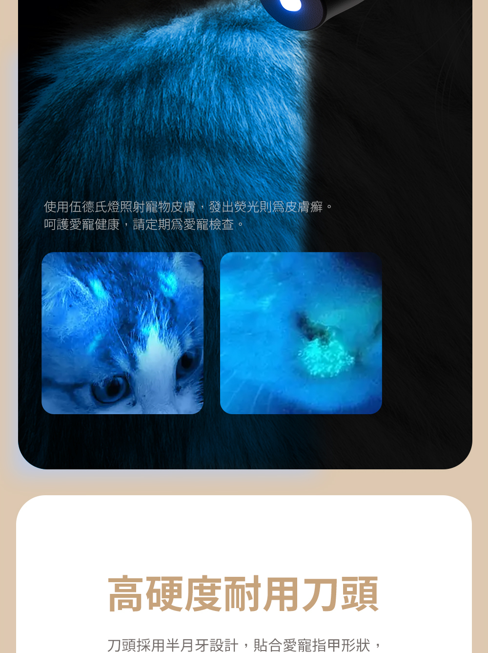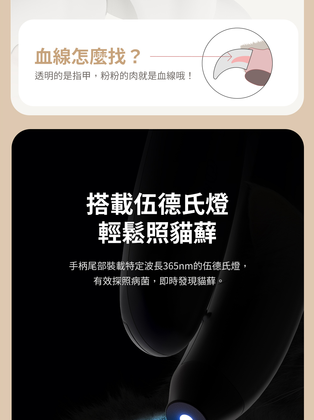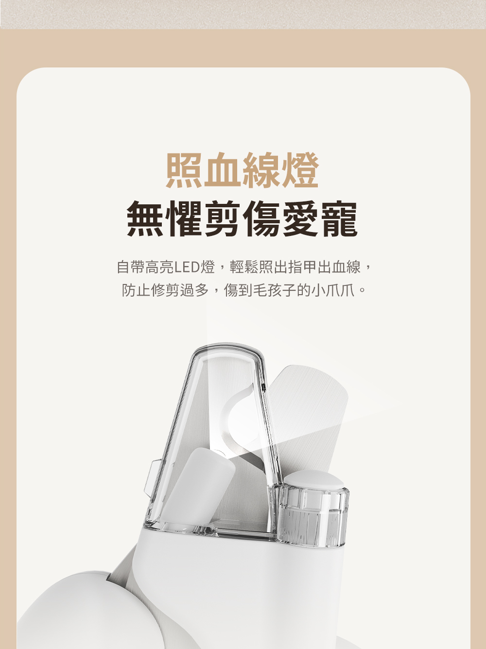 LED 導光燈:內置 LED 燈照亮修剪位置,避免切割血線。
