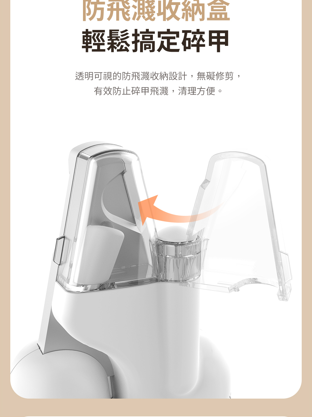 Nail Flyaway Shield:設有易於打開的指甲收集盒,收集並保護指甲修剪時的碎屑。